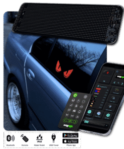 Simply plug the USB into a power source. use the app on your Apple or Android device. connect via Bluetooth. and unlock a world of features. Free-draw. free-text. upload your own images or GIFs. but here’s the kicker: Our App got an online library packed with tons of GIFs. Imagine cruising down the street with the coolest GIFs in the universe – your car’s gonna steal the spotlight like never before!
